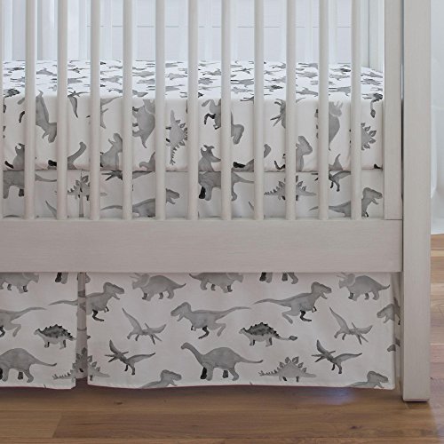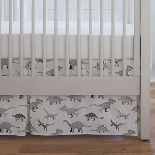 Product Description Gray Watercolor Dinosaurs crib skirt. Get your crib picture perfect with our single-pleat crib skirt. Finished length approximately 16-17 inches. Fits standard cribs using mattresses measuring approximately 28" x 52". Dry clean only. 0