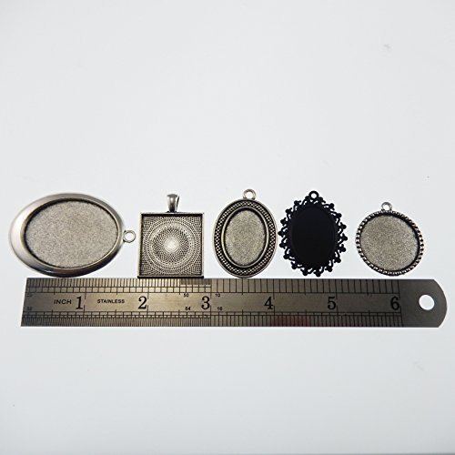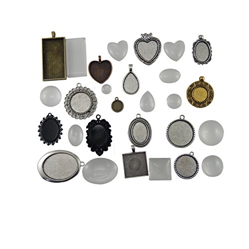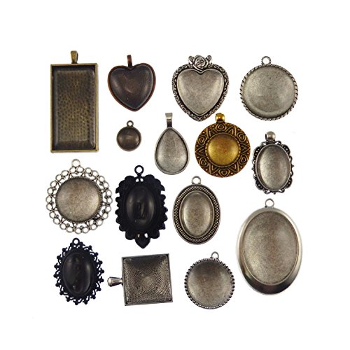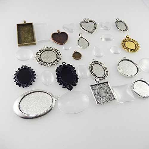 JulieWang 15 Sets Mixed Photo Setting Tray Pendant Glass Cabochons Round Oval Rectangle