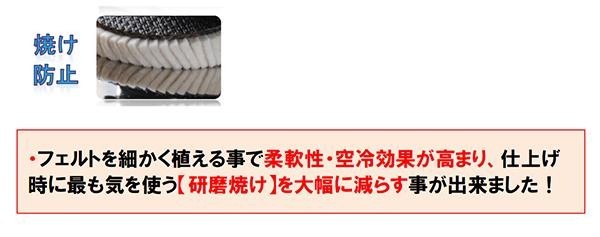 | フェルトを細かく植えることで柔軟性・空冷効果が高まり、仕上げ時に最も気を使う「研磨焼け」を大幅に減らすので、アルミなど熱に弱い素材でも仕上げやすい!!縦並び構造で凹凸面やパイプ研磨にも最適です。 |