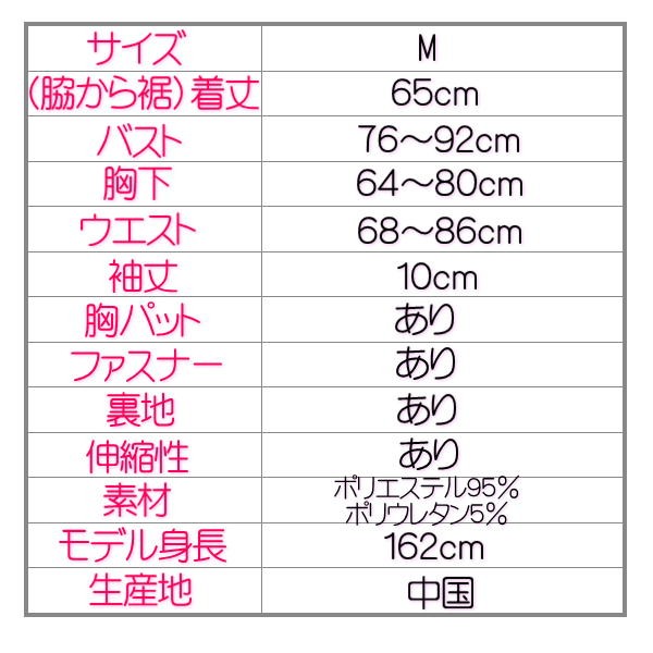 *********** 配送について *************■こちらの商品は、メール便のお届けは致しかねます。ゆうパック 送料580 でのお届けです。★¥5000以上お買い上げで送料無料!■郵便局留め可能■ラベル品名表記 衣類********** 手数料について ***********■お支払方法に代引き引換を選択されますと、お支払金額に手数料¥260が加算されます。ご了承下さいませ。*サイズ M*素材 表地 ポリエステル100% 裏地 ポリエステル95% ポリウレタン5%*生産地 中国*モデル身長 162cm◆総丈(脇から) 65cm◆バスト 76~92cm◆バストゴム なし◆胸下 64~80cm◆ウエスト 68~86cm◆袖丈 10cm◆パット あり◆ファスナー あり◆裏地 あり◆伸縮性 あり◆透け感 なし 袖のみあり