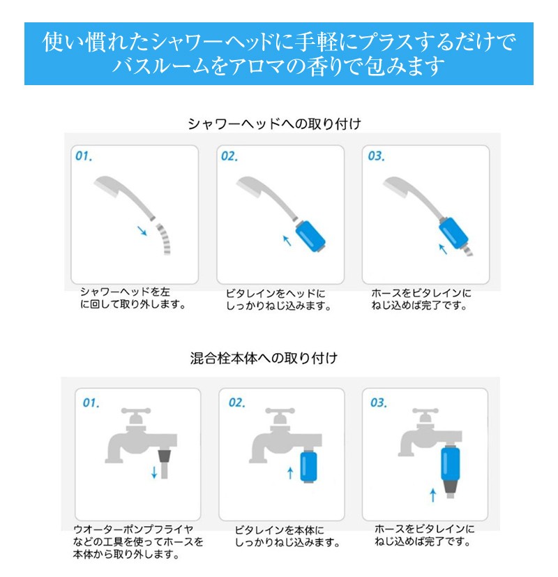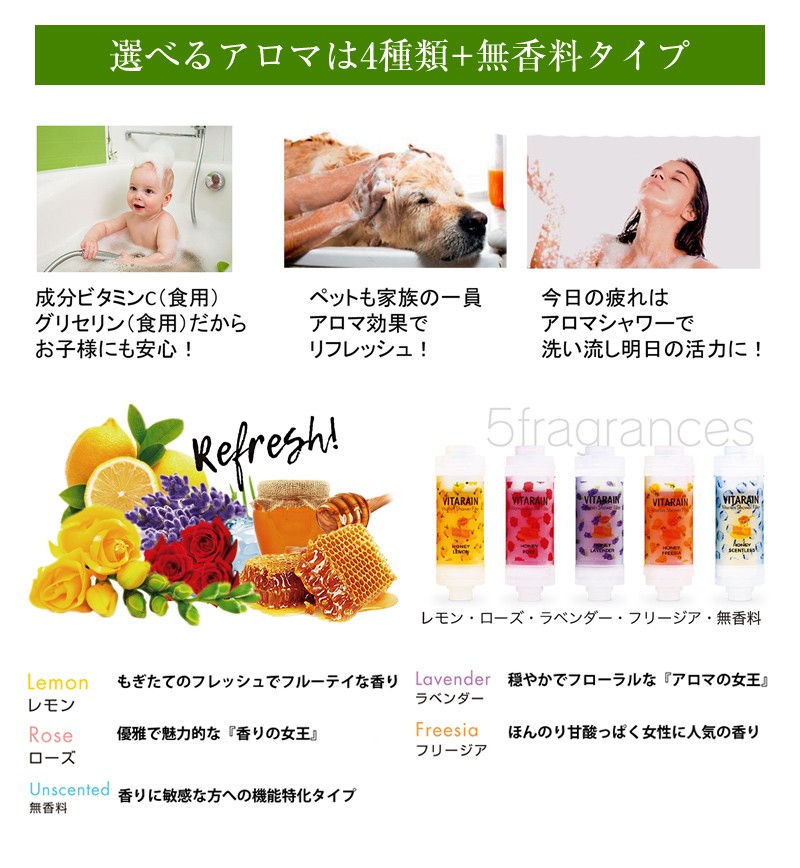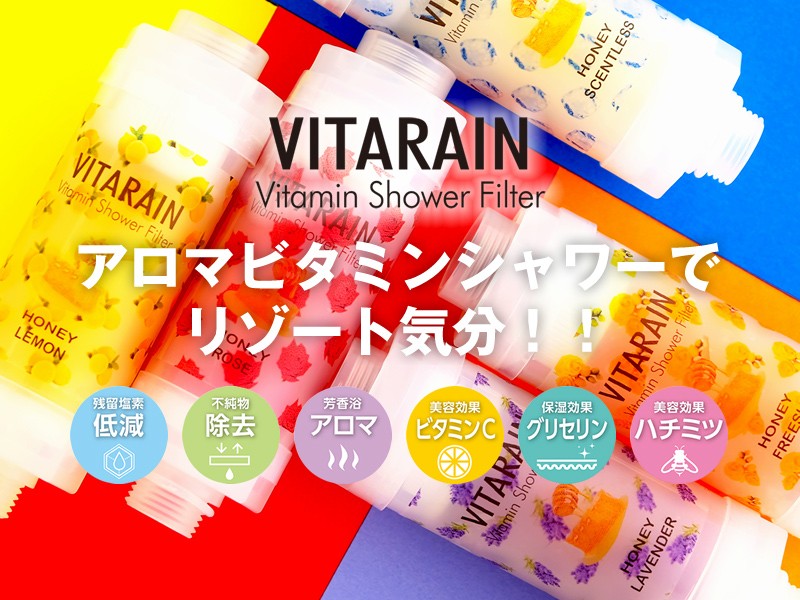 ビタミンシャワーフィルタービタレイン(VITARAIN)はビタミン配合の特殊ジェルが残留塩素をしっかり低減。ビタミンCと豊かに広がるアロマの香りで癒しを与えます。