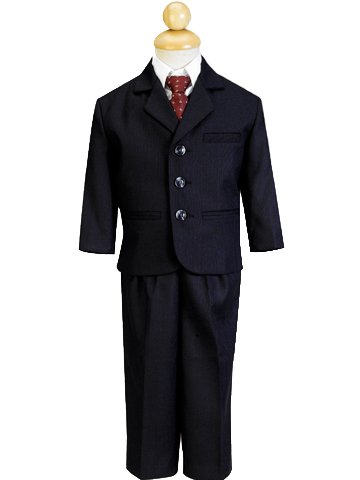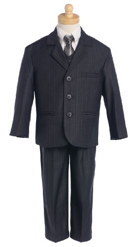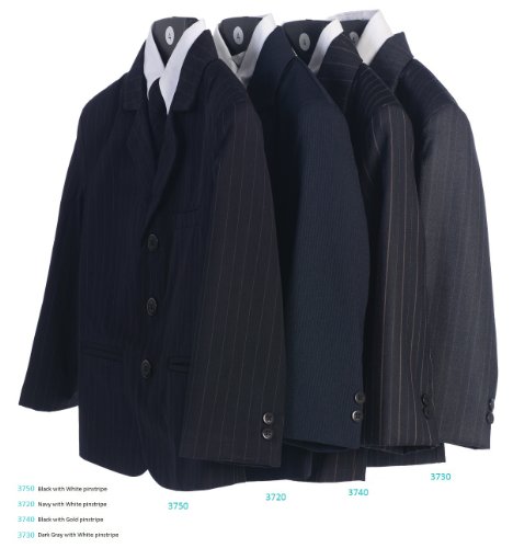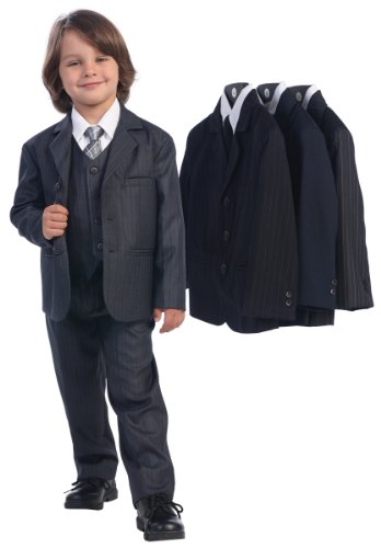 Binding : Apparel Product Description A handsome suit outfit for your boy. This 5-piece Dark Gray Pin-striped suit comes with a 3 pocket jacket, White button-down long sleeve shirt, matching Light Gray button-down vest and pants with a gray patterned zipper tie for perfect fitting every time.
