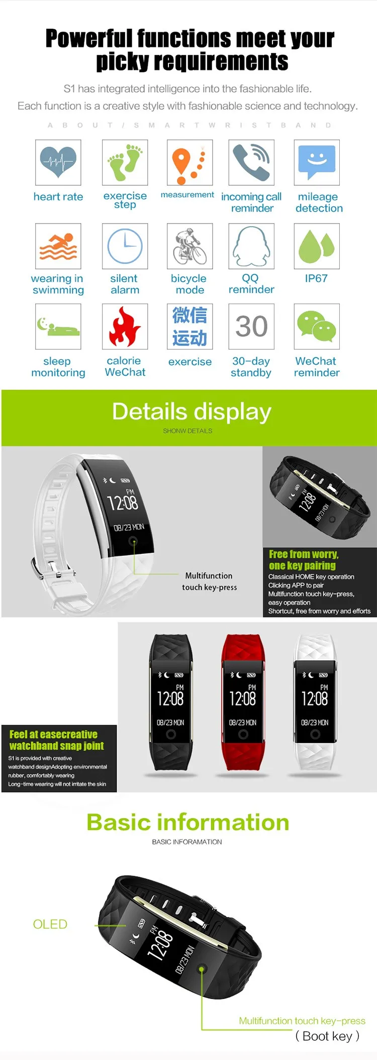 3).OLED; reminder for incoming calls & msg; caller ID display; Music player; Pedometer; Heart rate pulse; Waterproof