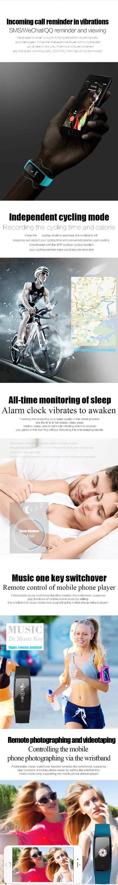 This Smart Bracelet can diaplay the time, steps, distance icon,Calories icon,camera icon,music icon clearly and so on. More convenient to operate!