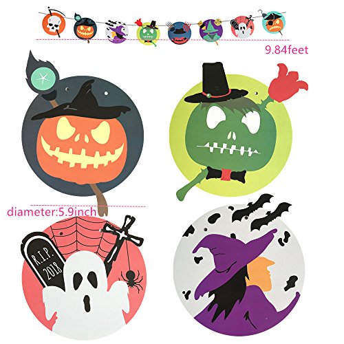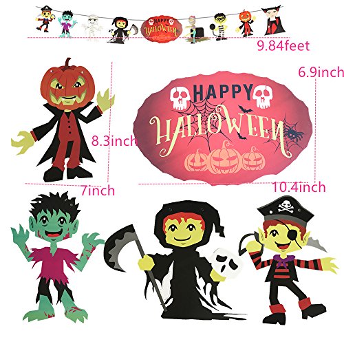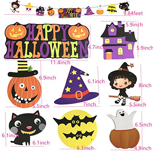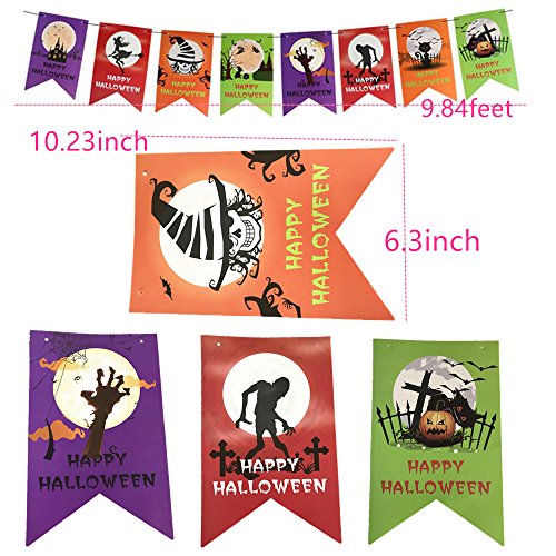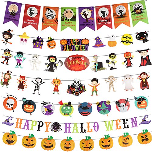 - ASSORTEN SIZES BANNER KIT-The package includes 7 pieces :one Halloween flag,one pumpkin banner,one small witch banner,one skeleton flag,one ghost banner,one pirate streamer,one happy halloween letter banner.
