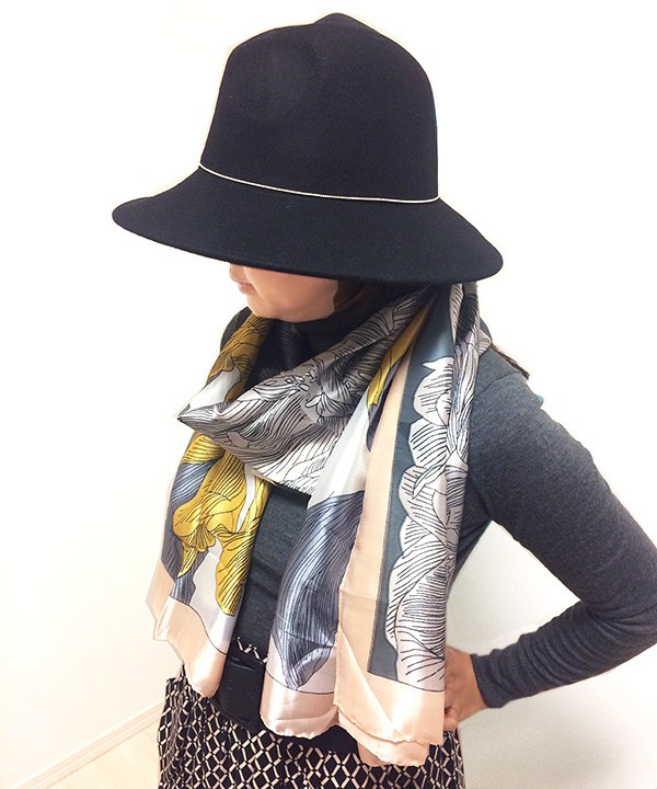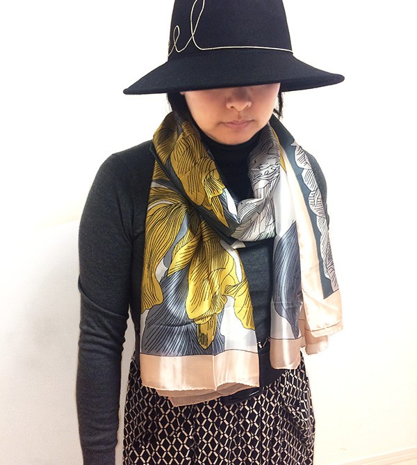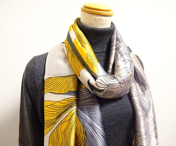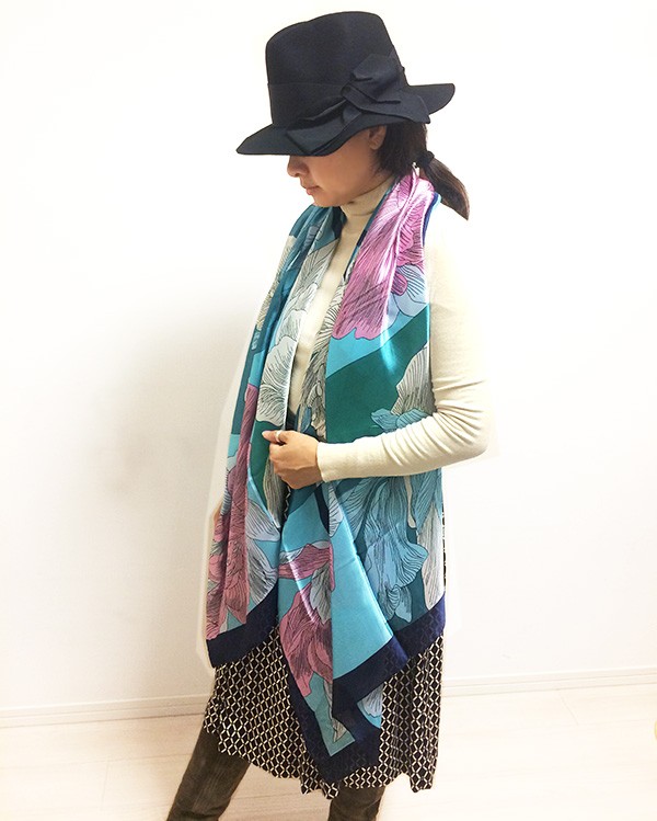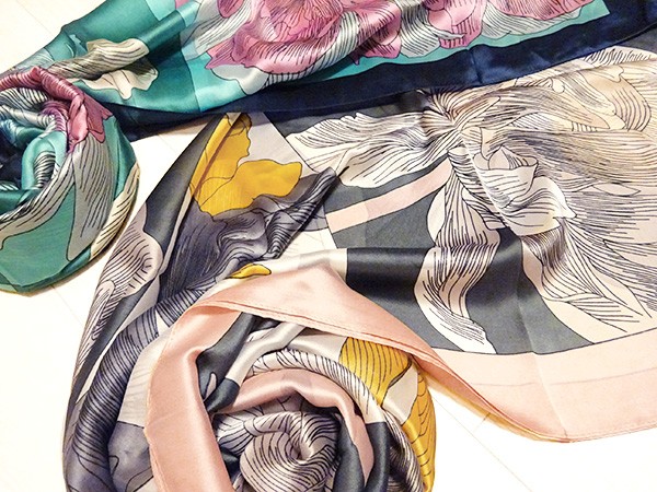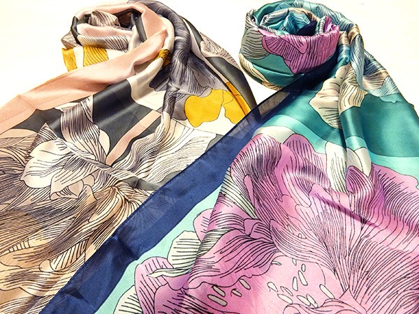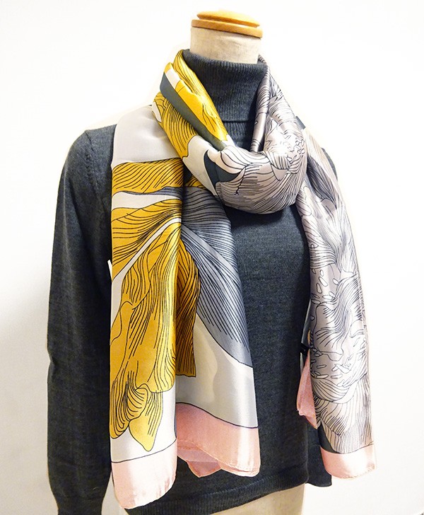 繊細な花々がプリントされたシルキータッチの大判スカーフ