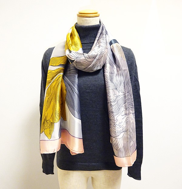 繊細な花々がプリントされたシルキータッチの大判スカーフ。