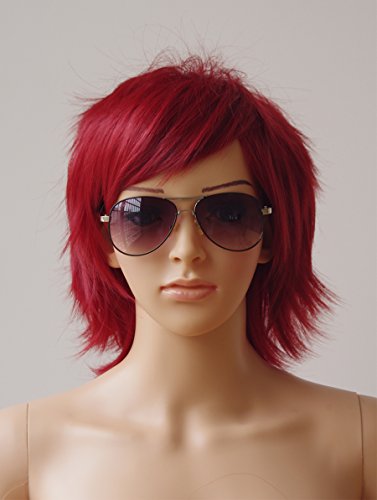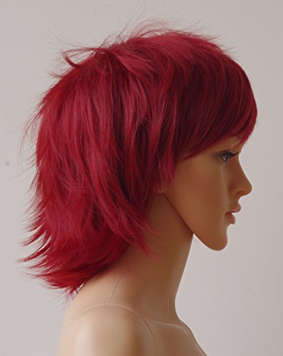 Short Cosplay Synthetic Wig with Bangs 99J Anime Layered Fluffy Hair Oblique Fringe Full Head Unisex for Man and Women Girls Lady (Wine Red)