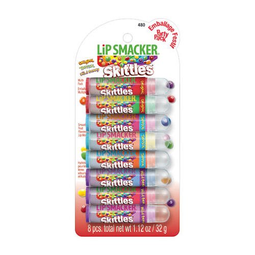 Original: Strawberry, Lime; Tropical: Strawberry Watermelon, Banana Berry, Mango Peach; Wild Berry: Raspberry, Strawberry, Berry Punch. Multi-pack. Smoothing fruit flavored lip balm. Enjoy your favorite Skittles mouth-watering candy flavors in a pocket-sized Lip Smacker. Now available in a new Party Pack assortment. Ultra-moisturizing ingredients smooth lips and the great Skittles flavors are sure to create smiles. Made in U.S.A.Feature