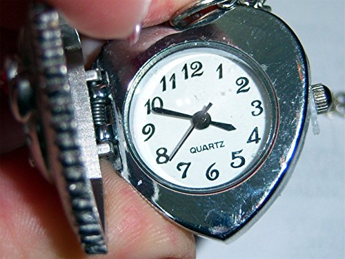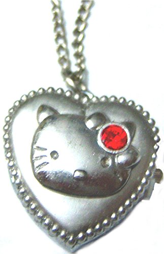 A brand new, unique hello kitty pendant watch. The watch measures 30mm long and is suspended by a 30" chain. It is made of metal alloy, with a red crystal accenting the traditional Hello Kitty headband. The case is alloy, hear shaped, with a brushed finish, and beaded edging, and opens to reveal the watch.