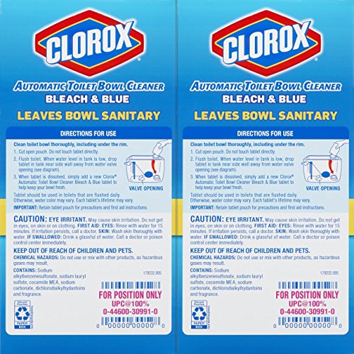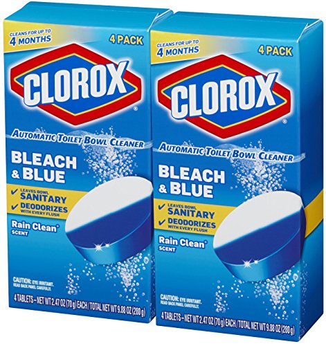 Clorox Automatic Toilet Bowl Cleaner Bleach & Blue tablet sanitizes and refreshes your toilet bowl with every flush. Designed to help prevent tough stains, this Bleach and Blue tablet let you spend less time scrubbing your toilet, just simply drop the tablet in your tank and let it do its work. And you will know it is working, because you will see sparkling blue water in your toilet bowl. Each tablet deodorizes the toilet bowl water in 5 minutes and continuously cleans for up to 4 months. When the water is no longer blue, you know it is time for another tablet. The tablet does not harm the septic tank. With Clorox, you know your toilet bowl is clean and disinfected.