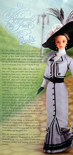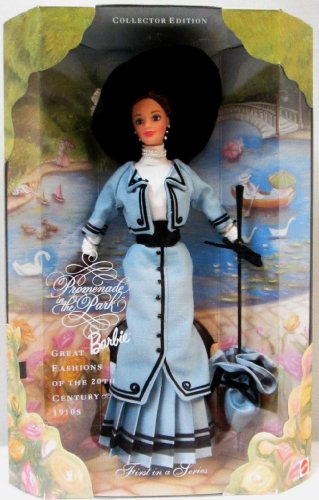 Studio : Mattel Publisher : Mattel Binding : Toy Product Description Great Fashions of the 20th Century 1998 Promenade in the Park Barbie #18630 is first in this series, which captures the fashion trends and statements from every decade in the twentieth century. Barbie doll wears a pale slate blue walking suit with ebony scroll trim, a sash, boots, gloves and a hat--a typical look of the 1910s. 0