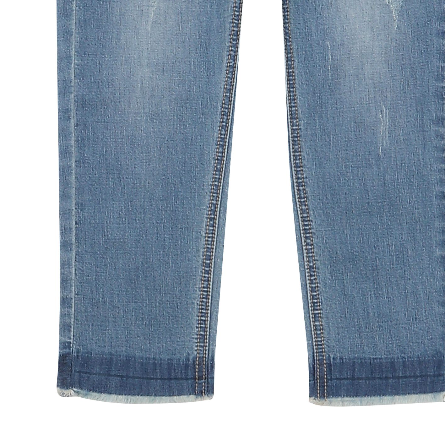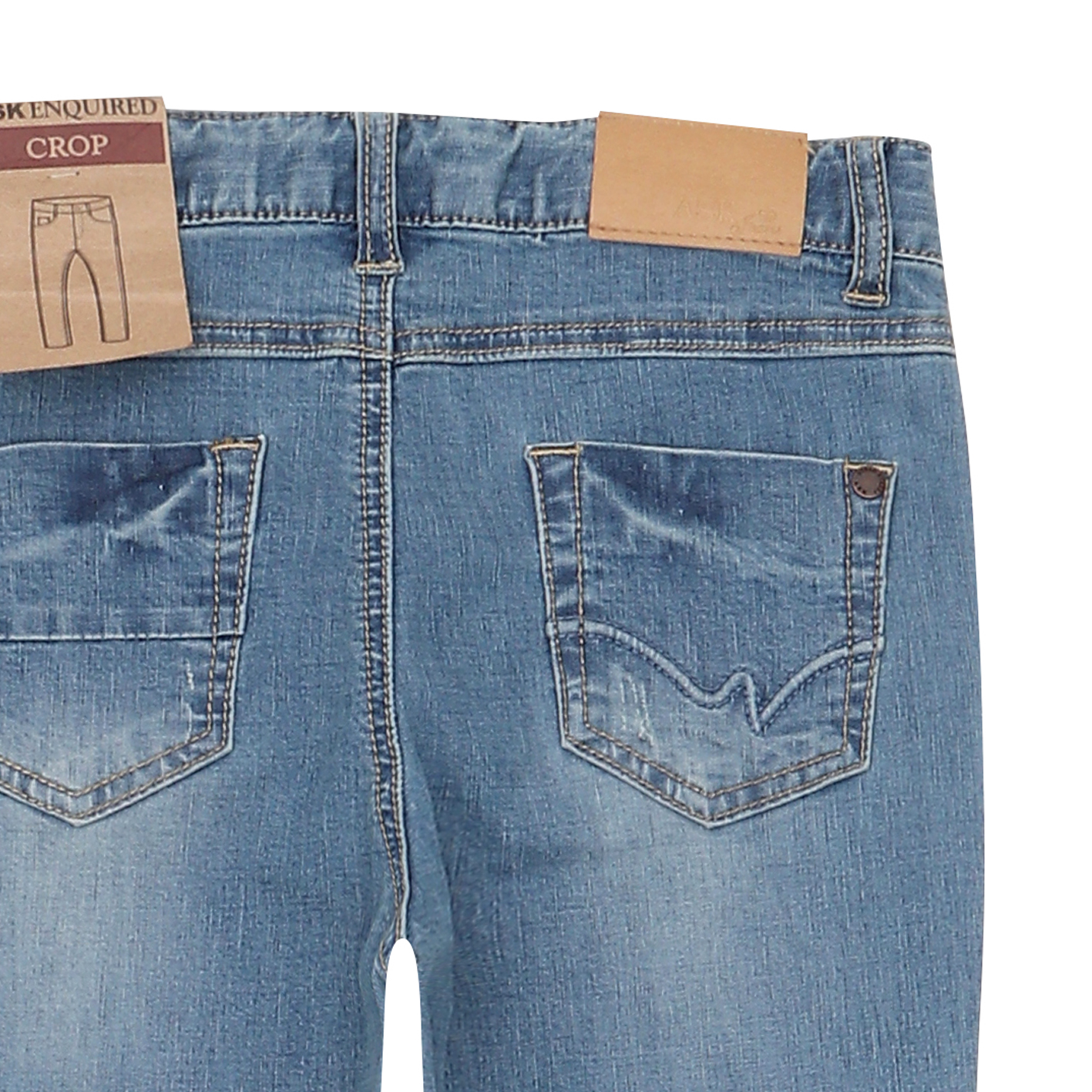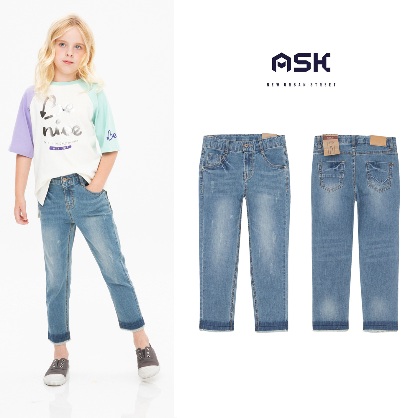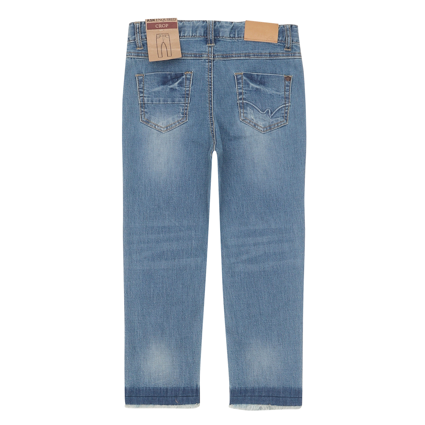 여아 8.5부 크롭데님. 밑단 자국워싱과 데미지로 포인트를 주었으며 스판성 우수한 아이템.