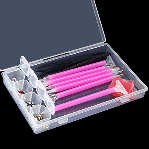 - Package Included: 3 different types of diamond sticky pen, 5 pieces plastic plates, 10 pieces of glue, 2 pieces plastic tweezers and 1 diamond embroidery box