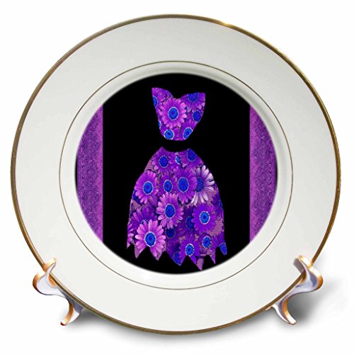 3dRose cp_30239_1 Purple and Blue Flowered Dress on Black Background with Damask Ribbons-Porcelain Plate, 8-Inch