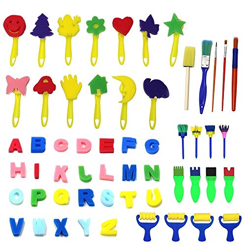- QUANTILY: 56 pieces include-4 x Stamp flower painting brushes,4 x Roller sponge brushes ,4 x sponge roller brushes,13 x ponge brush(Pentagram,heart,smiley,house,etc),2 x Paint Brush,2 x Fine brush,1 x Sponge shovel, 26 x English letters.