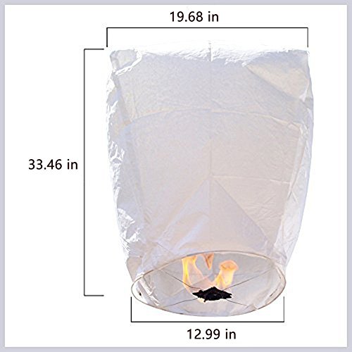 Specifications: Sky lanterns material: fire resistant rice paper Sky lantern color: white Sky lantern height: 76 cm/ 30 inch Sky lantern diameter: 33 cm/ 14 inch