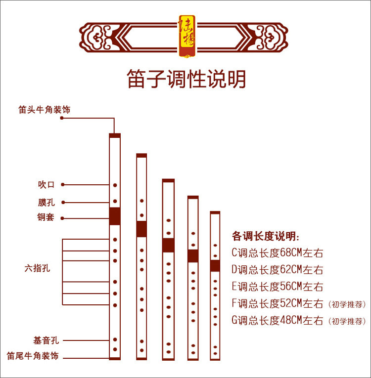 C:68cm,声音最低沉,笛子最粗最长,孔距离得最远。