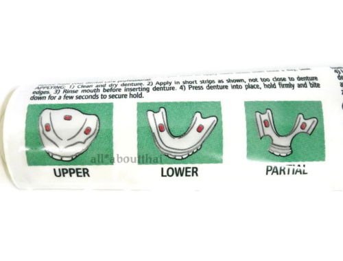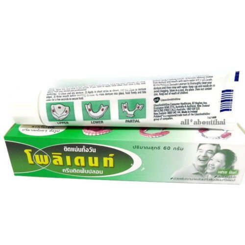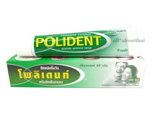 Studio : Thailand Publisher : Thailand Product Description Helps Seal out food Particles, More Secure fit Ingredient Poly(Methylvinylether/Maleic Acid) Sodium-Calcium Mixed Partial Salt, Carboxymethylcellulose, Petrolatum Blend W-180, Mineral Oil Light, Spray Dried Spearmint, Erythrosine Lake Paste, Propylparabe Size : 60 g Helpful hints : Apply once a day for secure hold. Start with a small amount. Using too much adhesive can cause oozing. Apply less next time if this occurs. If you need to apply more than once a day, seek advice from your dental care professional. Applying : 1. Clean and dry your dentures 2. Apply Polident in short strips as shown in the diagram, not too close to denture edges. 3. Rinse mouth before inserting dentures. 4. Press dentures into place, hold firmly and down for a few seconds to secure hold. Removing : 1. Swish mouth with warm water 2. Slowly remove dentures with rocking motion 3. Remove adhesive residue from denture and mouth with warm water and a soft brush. 4. Use Polident denture cleanse to thoroughly clean your denture and then rinse with water. 0