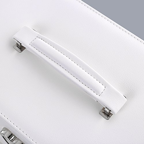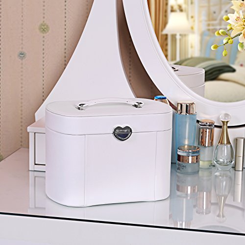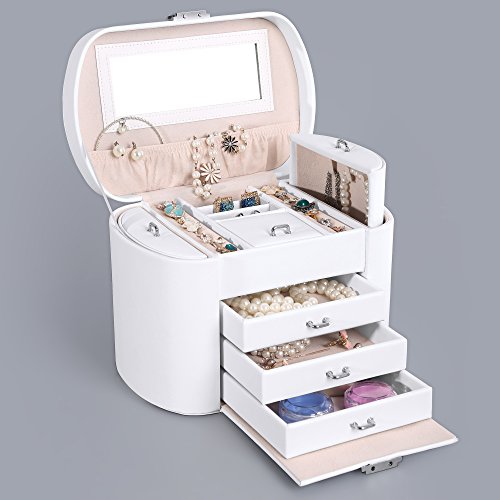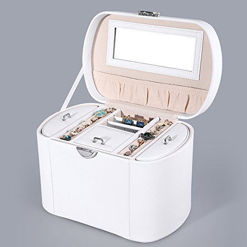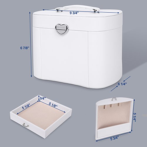 -. Feature : 11 DIVERSE COMPARTMENTS: 4-layer design, including 2 ring cases, 2 stud earring cards, 2 pull-up compartments with 6 necklace hooks & 2 pouches, 3 lower storage drawers; a multifunctional jewelry organizer for bracelets, earrings, hairpins, cufflinks, brooches etc / UNIQUE JEWELRY BOX: Elegant arc-shape outlook fits in any room; crafted from high quality white faux leather & soft cream velvet, a perfect gift for women and girls to protect their beloved jewelry from scratches and damage / CONSIDERATE DETAILS: With a grab-and-go handle, convenient to carry around; delicate heart-shape lock catch for one-hand easy opening, easy to use and saving your time / MIRROR DESIGN: Features an interior mirror, easy to admire the effect of wearing different kinds of jewelry / PORTABLE SIZE: Measures 9 3/4"L x 6 1/4"W x 6 7/8"H (24.7 x 15.9 x 17.4cm), portable as a travel case