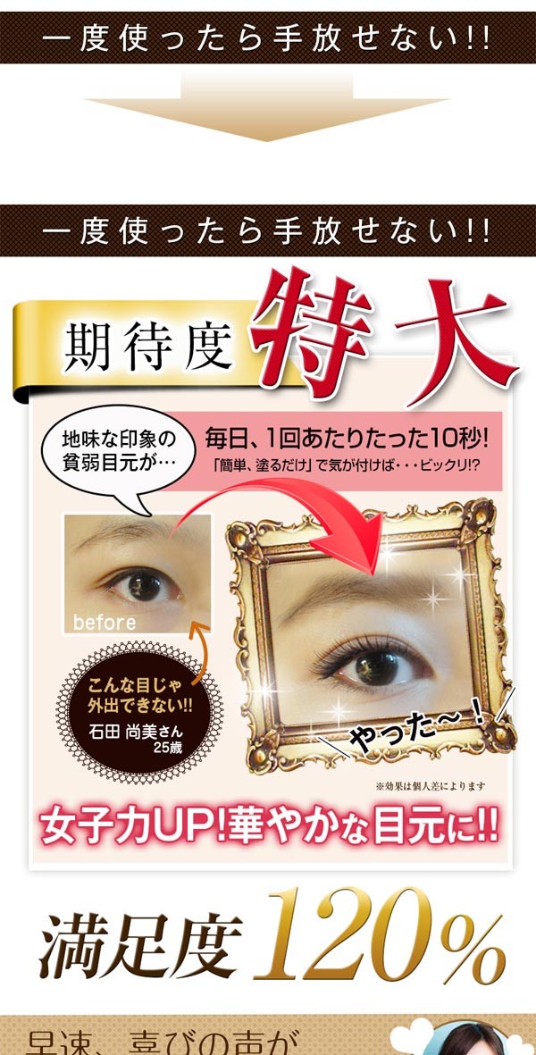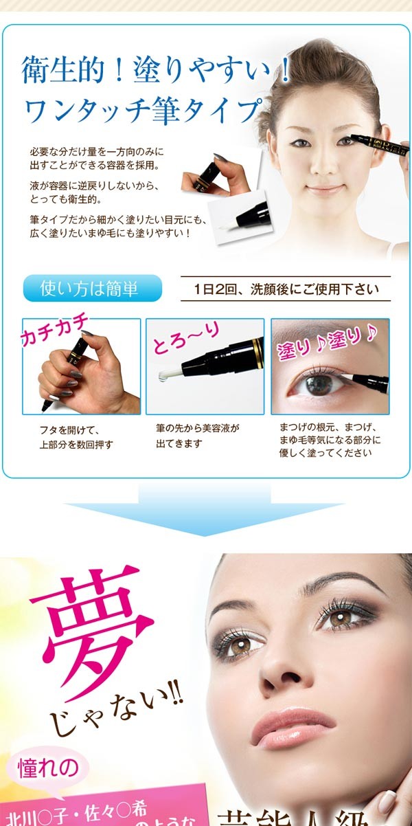容器の後部部分を押し筆先に美容液が浸透させ、適量を塗布してください。1日2回程度、洗顔後にお使いください。メイクをする場合はしっかり乾いてから行ってください。 |
