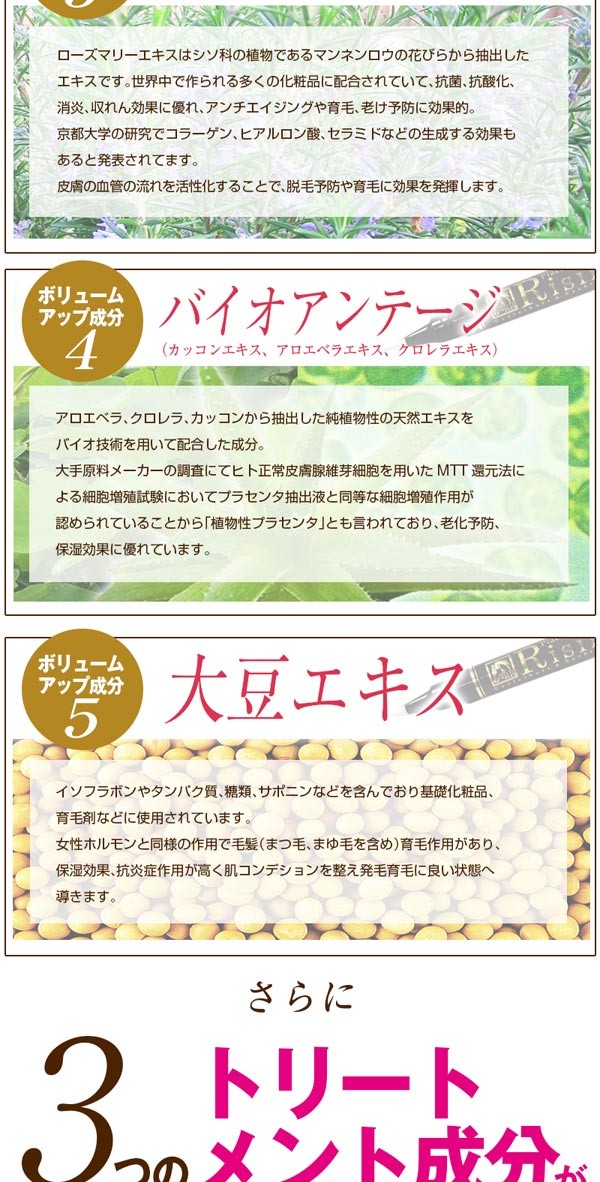 グリセリン、フェノキシエタノール、ヒトオリゴペプチドー5、ダイズ油、レシチン、加水分 解コラーゲン、プラセンタエキス、クズ根エキス、アロエベラ葉エキス、クロレラエキス、サイタイエキス、ラウリルジモニウムヒドロキシプロピル加水分 解ケラチン、センブリエキス、イラクサ葉エキス、