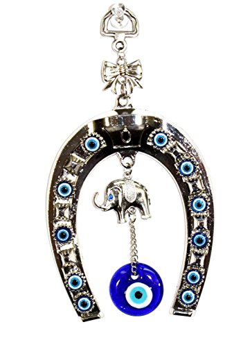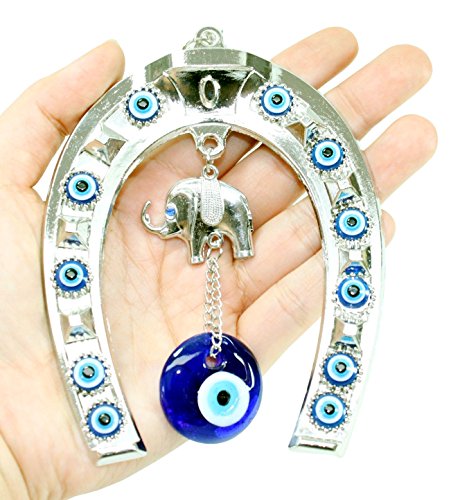 -. Feature : Blue Evil Eye Horse Shoe with Elephant Wall Hanging Charms. Blue evil eye - Mavi Nazar. / Size: 6.5"(H) X 3.5"(L) (approx.) / Display an evil eye at your home or office. / This charm can protect and bring luck to you. Elephant symbolizes power, wisdom, strength, fertility, protection of the home!! / Great for Birthday, Blessing and Congratulatory Gift!!