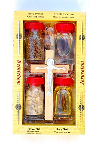 - This is a very rare gift box from the Holy Land israel the box includes a crucifix made out of Olive Wood from Jerusalem, Holy Water from the River Jordan, Frank Insense from Jerusalem , Holy Soil from Jerusalem; Olive Oil from Bethlehem,