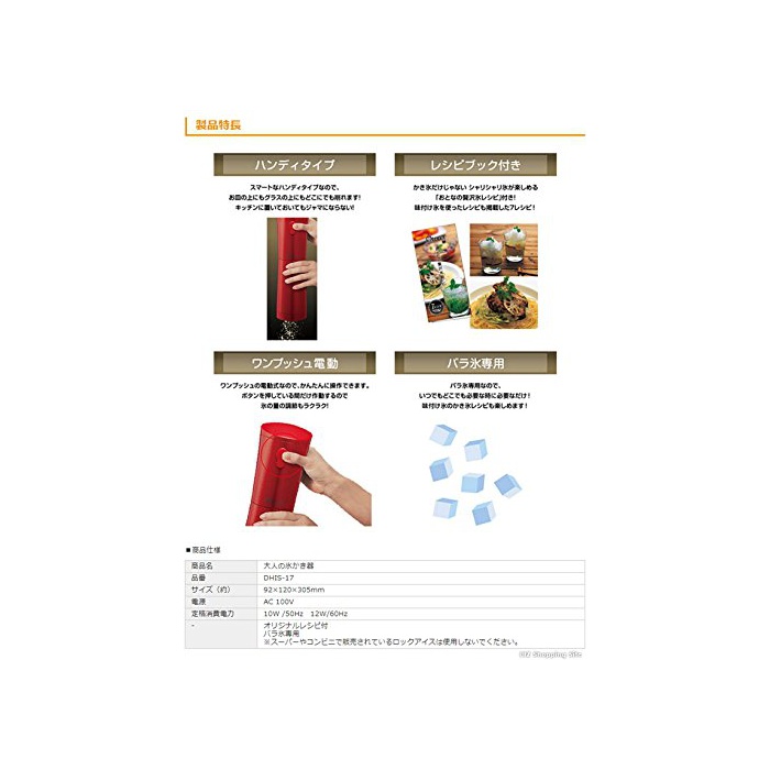 ◆장소를 잡지 않는 스마트한 핸디 타입. ◆원 푸쉬 전동식에 얼음의 분량도 조절하기 쉽다. ◆장미빙 전용이라 필요이 때 필요한 것 뿐(만,만큼) 빙수를 즐길 수 있다. ◆빙수 이외도 즐길 수 있다「어른의 호화빙 레시피(요리처리법)」부착.