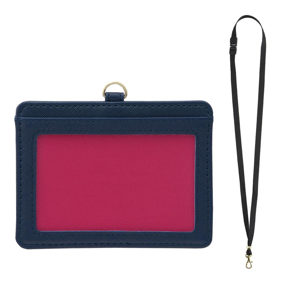 表ポケットには社員証などを、裏ポケットには名刺やカードの収容に。引っかかったり強い力が加わると、ネックストラップの留め具が外れる安全パーツ付。表地に高級感のある合皮を使用。 |