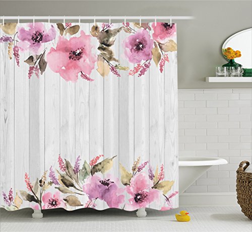 Ambesonne Rustic Home Decor Shower Curtain Set, Vintage Wood with Lavender and Violet Flowers English Country Floral Patterns, Bathroom Accessories Collection, Polyester Fabric,White Grey Purple