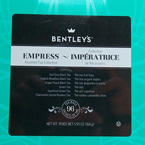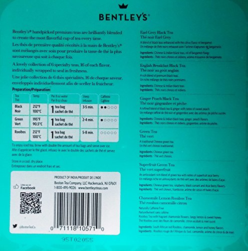 -. Binding : Misc. -. Brand : Bentley -. EAN : 0071118105710 -. Feature : Earl Grey Black Tea, English Breakfast Black Tea, Ginger Peach Black Tea / Green Tea, Superfruit Green Tea, Chamomile Lemon Rooibos Tea / Premium Estate teas in a decorative tin suitable for gift giving / 16 teas bags of each flavor; 96 bags total -. IsAdultProduct : 0 -. Label : The Boston Tea Company -. Manufacturer : The Boston Tea Company -. PackageQuantity : 1 -. ProductGroup : Grocery -. ProductTypeName : GROCERY -. Publisher : The Boston Tea Company -. Studio : The Boston Tea Company -. Title : Bentley Tea 6 Flavor 96 Bag Variety Sampler Gift Tin -. UPC : 071118105710