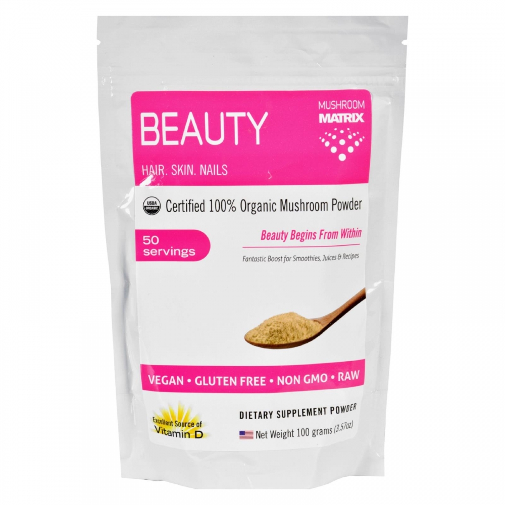 | Beauty really does come from within. Rejuvenated skin, lustrous hair and strong nails depend on the nutrients we feed our bodies. Beauty Matrix is made with Certified 100% Organic Mushrooms that deliver the nutritional power your body needs to shine from the inside out.* The selected eight species of medicinal mushrooms naturally supply Biotin, Vitamin D, immune-supporting beta glucan compounds and an array of antioxidants. These magic beauty mushrooms also help with the delivery of vital nutrients. That's it. No crazy chemicals you can't pronounce.* Provides antioxidants to protect against free radical damage and reduce oxidative stress Helps maintain normal DNA and the immune system Supports normal detoxification processes Assists in combating environmental pollutants Helps maintain optimal health Helps maintain physical and mental well-being Helps hair growth and shine * These statements have not been evaluated by the Food and Drug Administration. These products are not intended to diagnose, treat, cure, or prevent any disease. Ingredients : Contains proprietary, performance -tested strains of the following Certified 100% Organic Mushrooms: Pleurotus eryngii (King Trumpet), Cordyceps militaris, Trametes versicolor (Turkey Tail), Ganoderma lucidum (Reishi), Agaricus blazei, Hericium erinaceus (Lion's Mane), Grifola frondosa (Maitake) and Antrodia camphorata. Contains no added excipients, fillers or preservatives. Country of origin : USA Organic : Yes Gluten Free : Yes Yeast Free : Yes Wheat Free : Yes Vegan : Yes Kosher : Yes Size : 3.57 OZ Pack of : 1 Product Selling Unit : each |