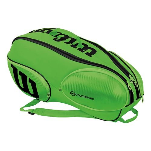 Studio : Wilson Publisher : Wilson Binding : Misc. Product Description Wilson serves up a new "reverse" cosmetic look to the Wilson Blade 9 Pack Tennis Bag. Now instead of black as the predominant color, Wilson has moved towards Green as the primary color for the 9 pack racquet bag. The Wilson Blade 9 pack tennis bag is the ideal option for the player seeking a bag a tad smaller than the larger 12-15 pack bags, but still, offers plenty of room for all of one's gear. The Blade 9 Pack features a unique soft outer shell on both sides of the bag that allows for the ultimate protection while still maintaining the bags intended shape. Wilson designed this Blade 9 pack bag as one of the most durable bags on the market today. The bag itself features two large main compartments which have the capacity to hold up to 9 uncovered racquets. One of the two central compartments features Wilson's Thermoguard 2.0 technology- allowing for protection of both strings and the racquets, fighting off any weather condition. Extra accessory pockets to go with padded backpack straps, ensures a comfortable carry to and from the court. 0