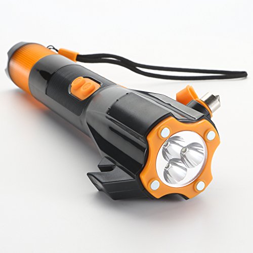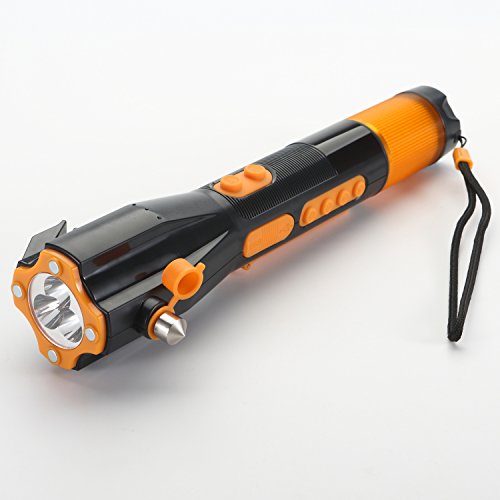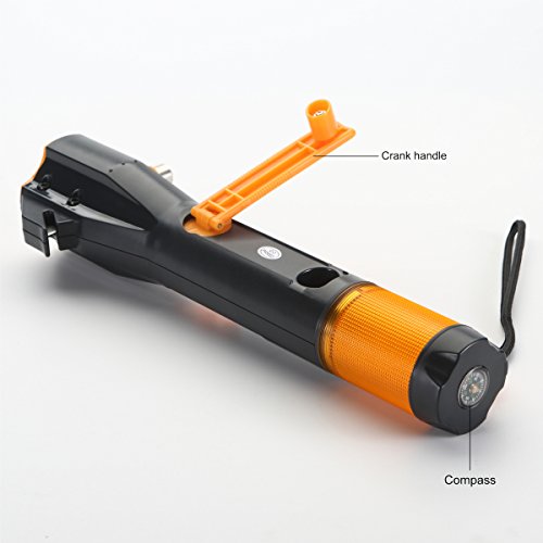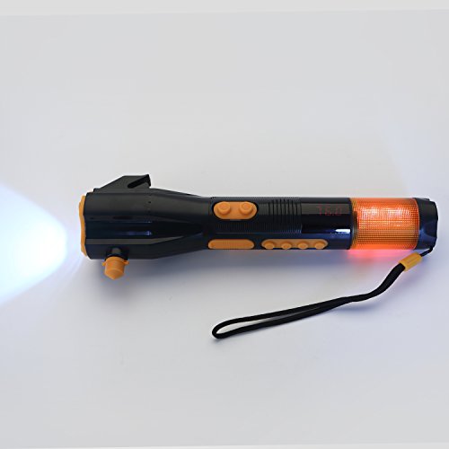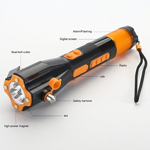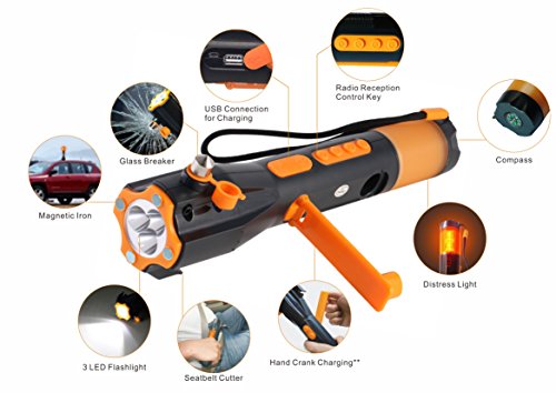 LED Flashlight via Self Dynamo, Window Breaker and Seatbelt Cutter, Digital Radio with Magnetic Iron, Build-in Compass plus Siren alert, Charging cell phone via USB connection