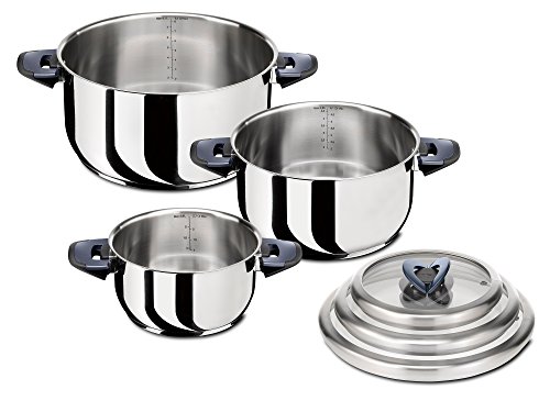 -. Feature : Optimale Platzersparnis in jeder Küche: Sechs-teiliges stapelbares Kochtopfset aus hochwertigem Edelstahl / Kochtöpfe Ø 20 cm (2,4 l) + Ø 24 cm (4,8 l) + Ø 28 cm (8,1 l) / Klappbares Griffsystem: ermöglicht das perfekte Ineinander-Stapeln der Töpfe / Glasdeckel mit klappbaren Deckelgriffen und Dampföffnung; Pefekt stapelbar; Mit abgrundetem Schüttrand für tropffreies Ausgießen / Geeignet für alle Herdarten, auch Induktion, induktionsgeeigneter Kapselboden