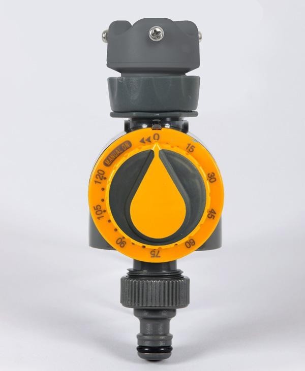 電池不要、操作が簡単な散水タイマーです。止水までの時間を設定して、水やり・スプリンクラーを希望時間にストップできます。タイマー設定時間は、5分刻みで120分まで設定可能。 |