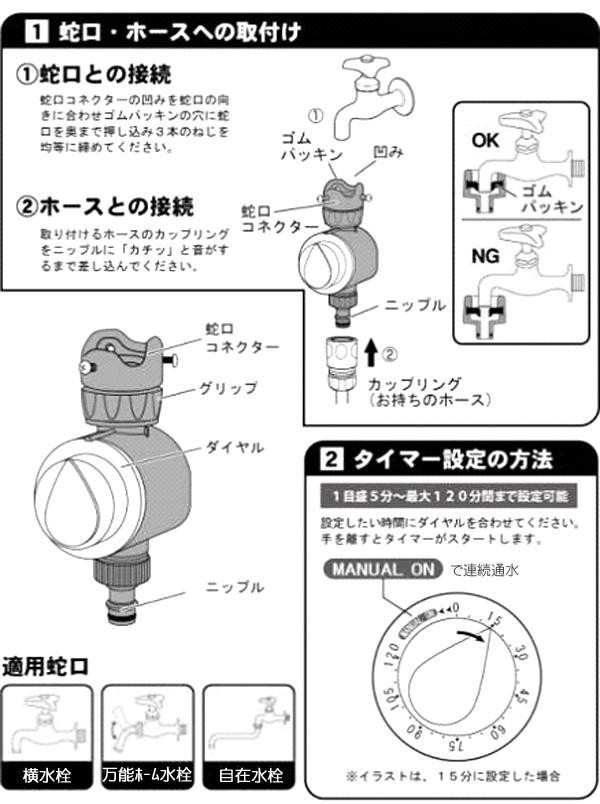 | 電池不要、操作が簡単な散水タイマーです。止水までの時間を設定して、水やり・スプリンクラーを希望時間にストップできます。タイマー設定時間は、5分刻みで120分まで設定可能。 |