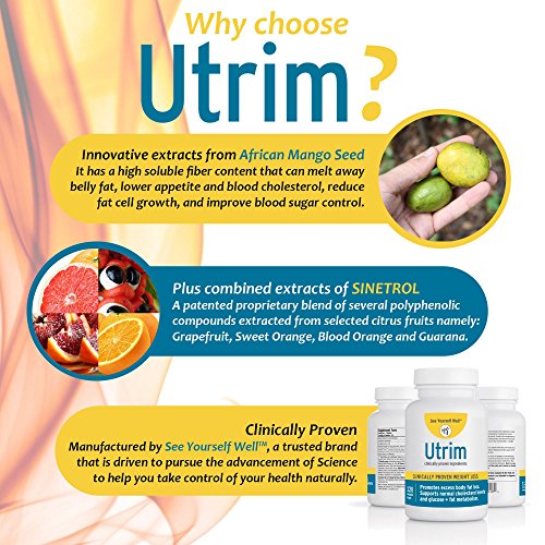 -. Feature : POWERFUL, EFFECTIVE, HEALTHY & SAFE WEIGHT LOSS, Utrim is a clinically formulated neutraceutical developed by internationally recognized clinical research scientist Dr Pradeep Visen. The Formula is designed for individuals seeking serious weight loss, and to keep it off, rather than a quick fix from the latest diet pill or fad. Formulated for MEN, WOMEN & CHILDREN OVER 12! / CLINICALLY PROVEN & TRADEMARKED INGREDIENT 1: AFRICAN MANGO EXTRACT (IGOB131) In a 10 week double blind, randomized, placebo controlled study, 102 overweight subjects received 150mg of African mango (IGOB131) extract twice a day. Subjects lost an average of 28 pounds, 6.7 inches from their waist line and reduced their body fat by 18.4% compared to the control group / CLINICALLY PROVEN & TRADEMARKED INGREDIENT 2: SINETROL: STANDARDIZED FRUIT AND SEED EXTRACTS In a 12 week double blind, randomized, placebo controlled study, 47 overweight subjects were given 450mg of Sinetrol twice a day. Body weight was significantly reduced by 2.61 kg, abdominal body fat by 10% (7% more than placebo) and waist and hip measurements by 5%. / RELATED HEALTH INGREDIENTS: Garlic Extract for heart health. Lipoic Acid for increased energy and optimal blood sugar levels. Chromium Picolinate for more good and less bad cholesterol. And Niacin, a form of Vitamin B3 for keeping blood pressure in check / MADE EXCLUSIVELY for those who choose to take control of their health - who prefer premium health supplements, safely manufactured - you are dealing with the manufacturer, not a P.R.Ivate label seller
