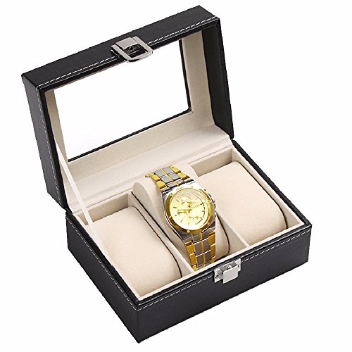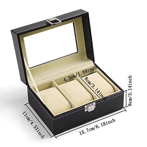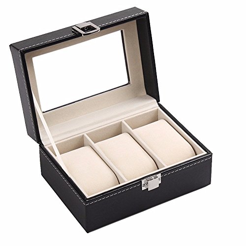 Wuligirl 3 Mens Small Watch Boxes Wooden PU Leather Glass Top Watches Case Jewelry Organizer Display Storage with Lock for Men and Women(3 Slots)