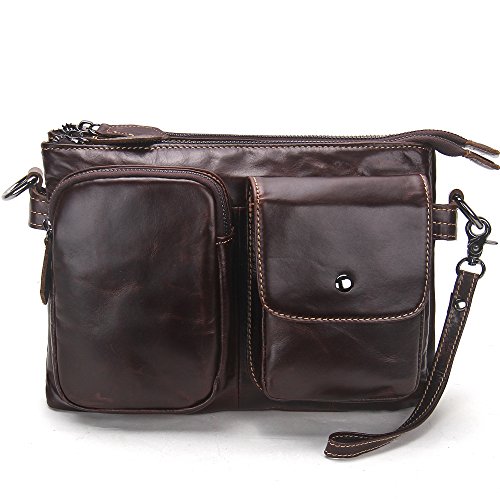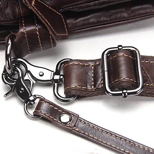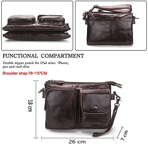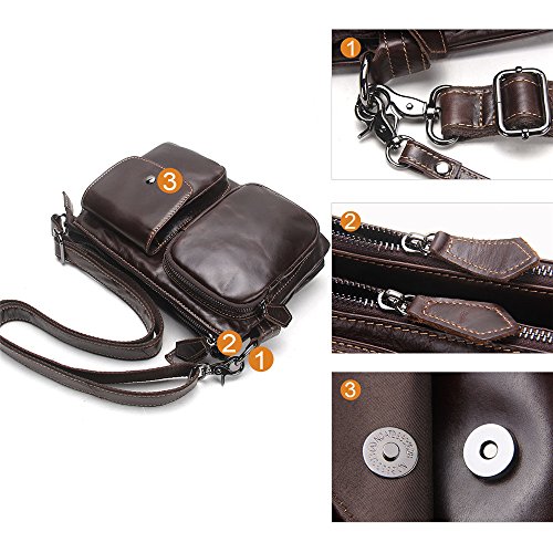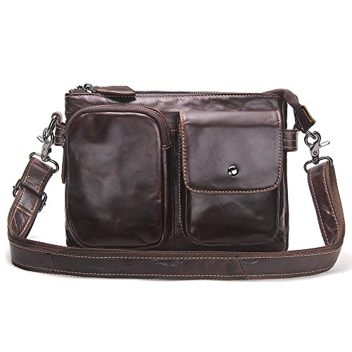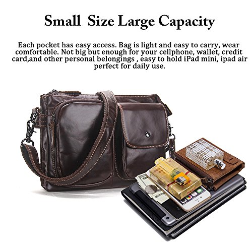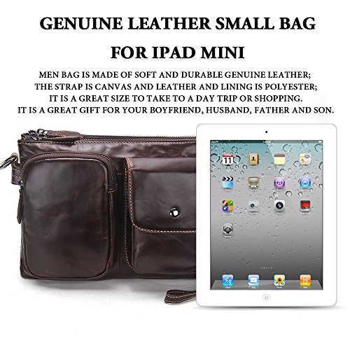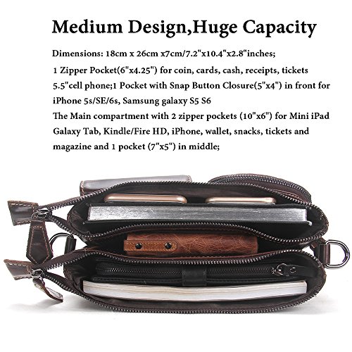 -. Feature : Men bag is made of Soft and durable genuine leather; the strap is canvas and leather and Lining is Polyester; it is a great daypack for school, dating, shopping and traveling in daily life. / Dimensions: 18cm x 26cm x7cm/7.2"x10.4"x2.8"inches; It is a great size to take to a day trip or shopping. It is a great gift for your boyfriend, husband, father and son. / 1 Zipper Pocket(6"x4.25") for coin, cards, cash, receipts, tickets, 5.5" cell phone;1 Pocket with Snap Button Closure(5"x4") in front for iPhone 5s/SE/6s, Samsung galaxy S5 S6 / The Main compartment with 2 zipper pockets (10"x6") for Mini iPad/Galaxy Tab, Kindle/Fire HD, iPhone, wallet, snacks, tickets and magazine and 1 pocket (7"x5") in middle; / 100% Money Back Guarantee! If have any problem or don't satisfy, please contact us and we will refund all or resend a replacement.