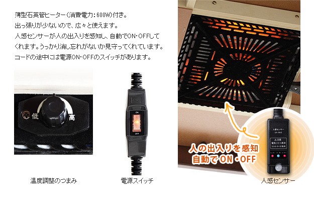 【人感センサー付】薄型石英管ヒーター(600W・中間スイッチ式)、コード長3m