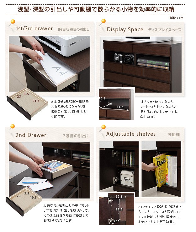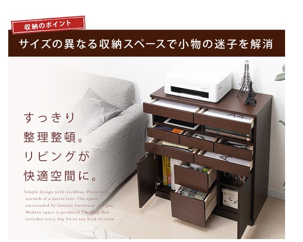 商品について:タモ天然木の木目が美しい、引出しがいっぱいついた大容量タイプのキャスター付きFAX台★マルチキャビネットとしてもお使いいただけるデザインです。背面には収納スペースがあり、ルーターやモデム・コンセントタップや配線類などをスッキリとまとめられます。