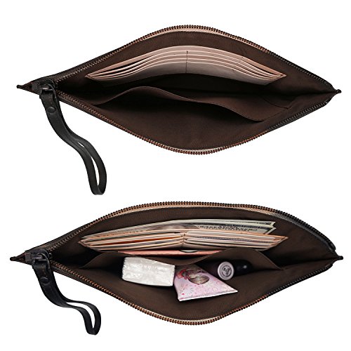 - Dimensions: 10.82"L x 7.48"W Multifunctional Wristlets: 2 x open pocket inside, 8 x credit card slots and wristlet and shoulder straps included. Unique designed for you to keep your wallet, keys, note book, make-up well organized. Scratch resistant and durable with classic and vintage design
