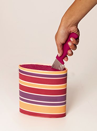 - Feature : High carbon stainless steel blades for strength and durability / Rod insert is removable for easy cleaning / Set includes: 5-inch santoku, 5-1/2 inch serrated utility knife, 3-1/2 inch paring knife and all purpose shear / Flex rods allow for customer to add other knives from home into the block / Dishwasher safe