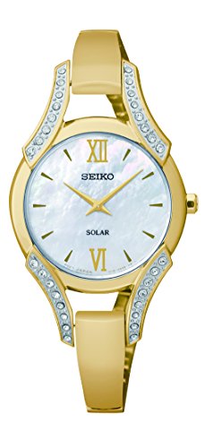 Round gold-tone watch featuring mother-of-pearl dial, crystal-studded lugs, and gold-tone indices