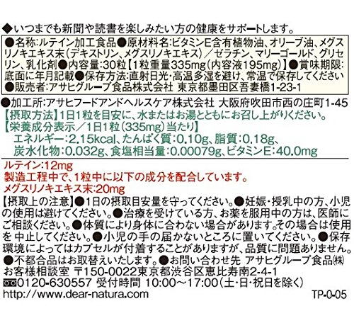 栄養成分 : 1粒(335mg)あたり ルテイン12mg, メグスリノキエキス末20mg, ビタミンE40mg
