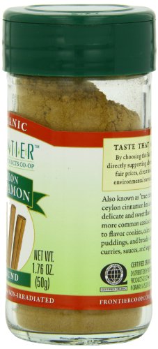 -. Binding : Grocery -. Brand : Frontier -. EAN : 0089836194565 -. Feature : 1.76 Ounce Bottle / Fair Trade, organic Ceylon cinnamon, with a more delicate flavor than other cinnamons / Certified Organic, Non-GMO Verified, Fair Trade Certified / Non-Irradiated, Kosher / Frontier is a member owned co-op, responsible to people and planet -. Label : United Natural Foods, Inc. -. LegalDisclaimer : Actual product packaging and materials may contain more and different information than what is shown on our website. We recommend that you do not rely solely on the information presented and that you always read labels, warnings, and directions before using or consuming a product. Please see our full disclaimer below. -. Manufacturer : United Natural Foods, Inc. -. Model : 0 -. MPN : 95589 -. NumberOfItems : 1 -. PackageQuantity : 1 -. PartNumber : 95589 -. ProductGroup : Grocery -. ProductTypeName : GROCERY -. PublicationDate : 2011-08-14 -. Publisher : United Natural Foods, Inc. -. Size : 1.76 OZ -. Studio : United Natural Foods, Inc. -. Title : Frontier Natural Products Cinnamon, Og, Grnd Ceyln, Ft, 1.76-Ounce -. UPC : 089836194565