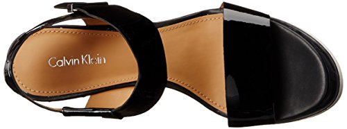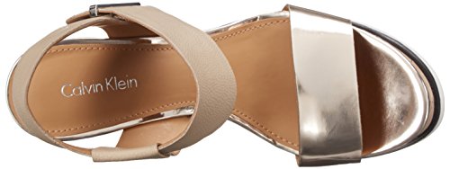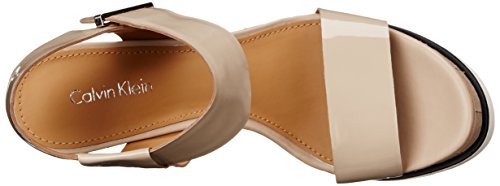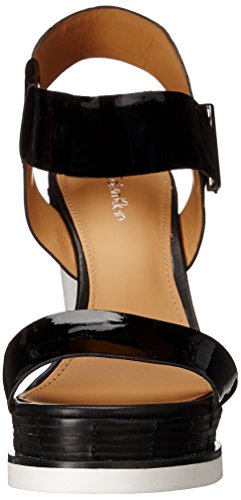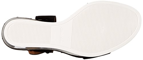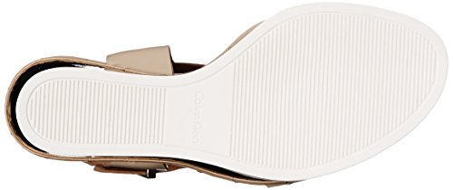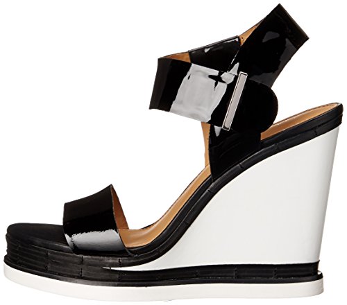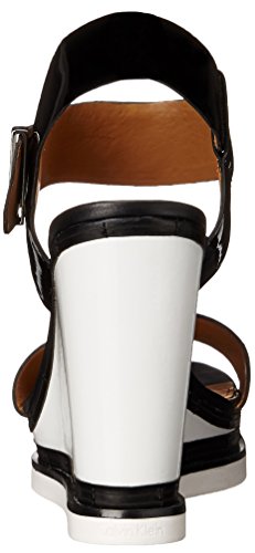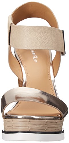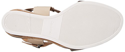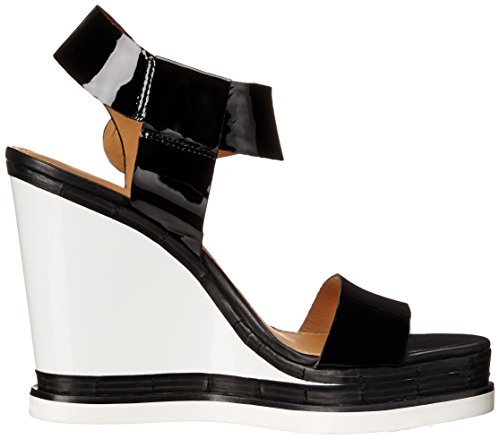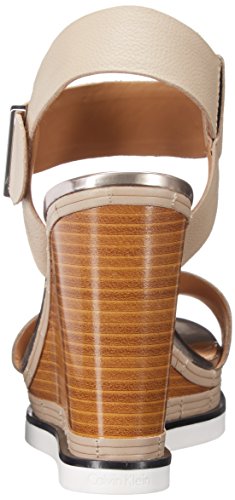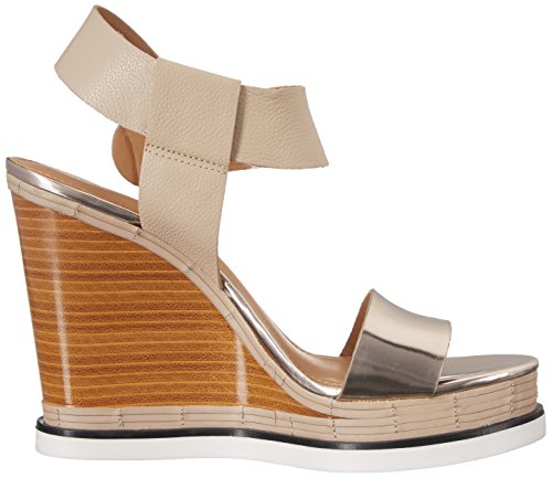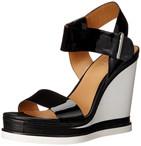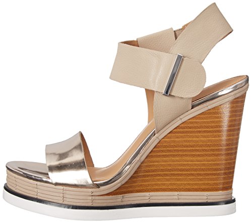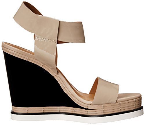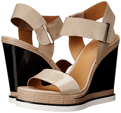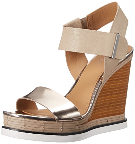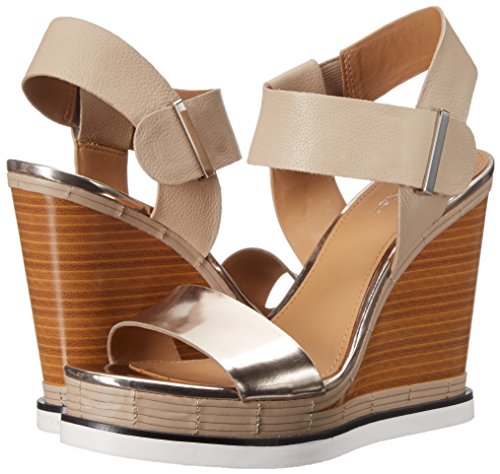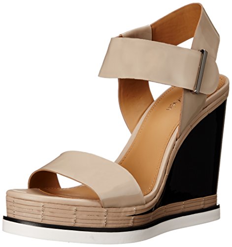 Modern wedge sandal featuring stacked leather bands at platform and midsole