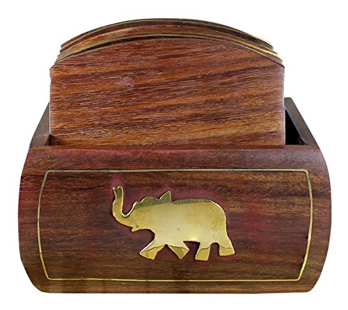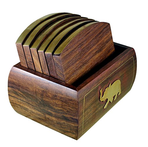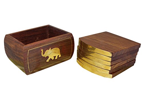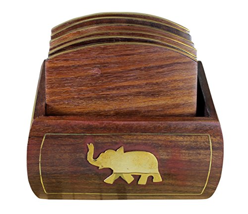 Coasters Set 6 Drink Coaster Wooden Handmade Natural Wood Holder Vintage Brass Inlay Elephant - 4 Inch